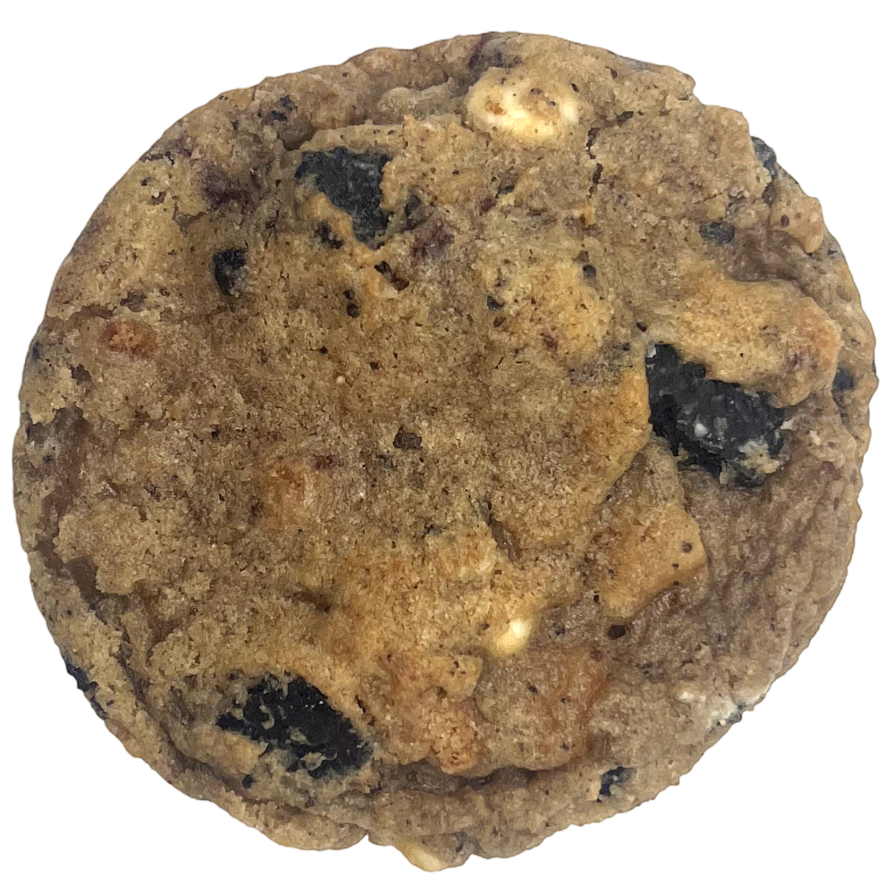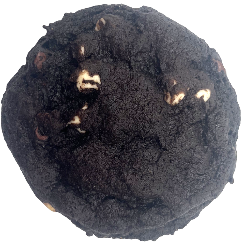 A midnight chocolate cookie featuring semi-sweet, dark, and white chocolate chips!